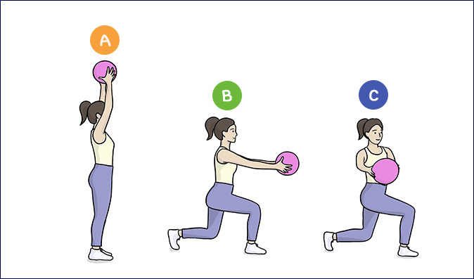 양팔에 긴장감을 주어 팔의 근육 강화와 함께 런지 자세로 다리 근육 강화도 함께 가능한 운동