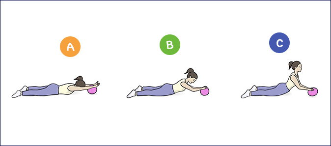 엎드려서 공을 집는 자세로 팔 및 코어 근육을 기르는 동작